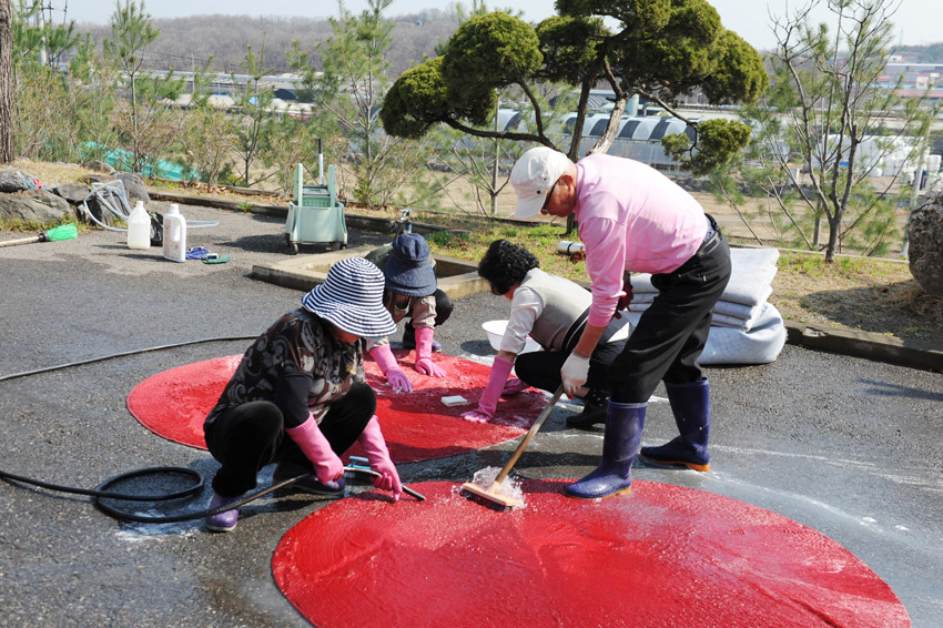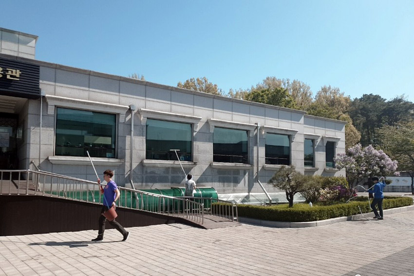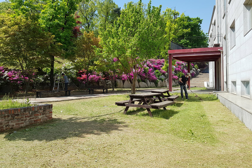 뒤돌아서면 바로 쌓이는 송홧가루 청소부터 제초작업, 유리창 물청소와 분수대 청소 등등 아주 바쁘네요.