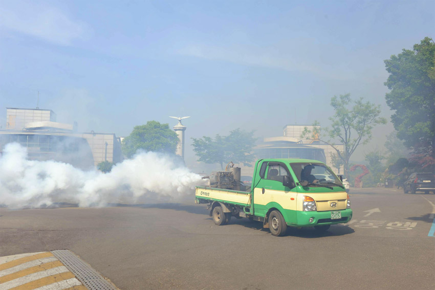 오후에 방역차량이 다녀갔는데요, 지난 달부터 정기적으로 다니고 있습니다.