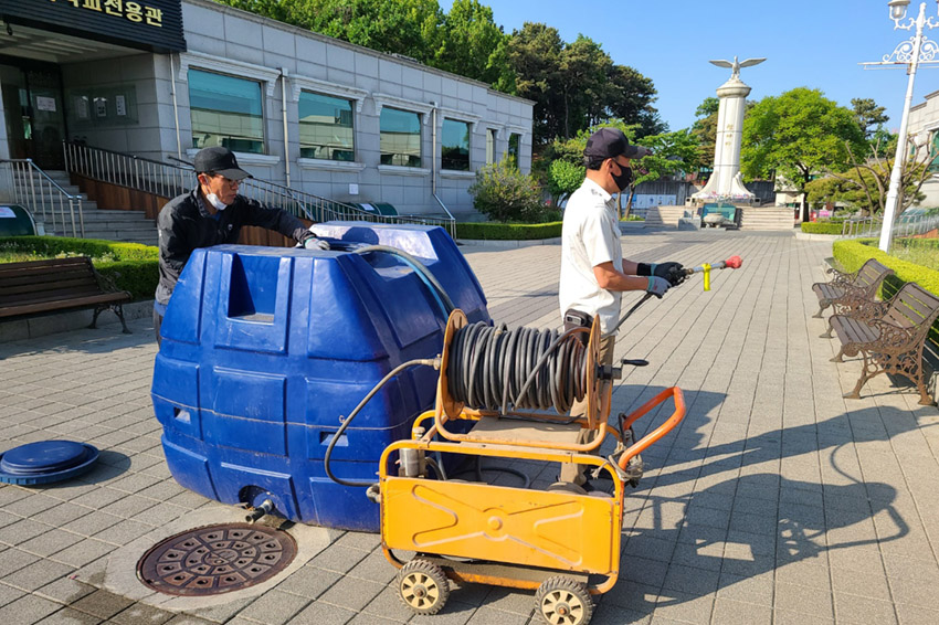 이른 아침에 광장과 진입로등의 정원수들에게 진딧물방제제와 영양제를 살포했습니다.