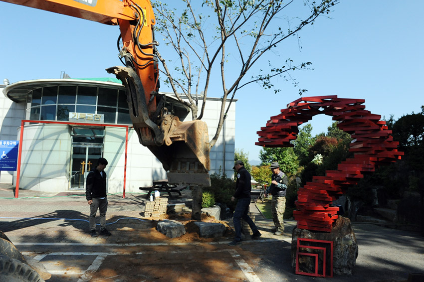 오늘 청아비 뒤편 주차장에 벚나무 두그루를 이식했습니다.