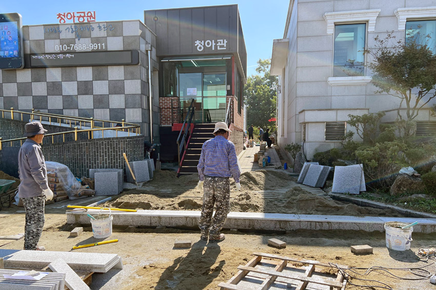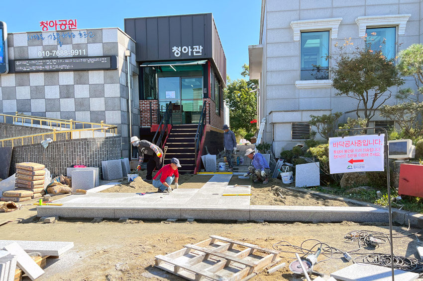 청아관 앞의 나무데크를 뜯어내고, 화강석으로 시공했습니다.
