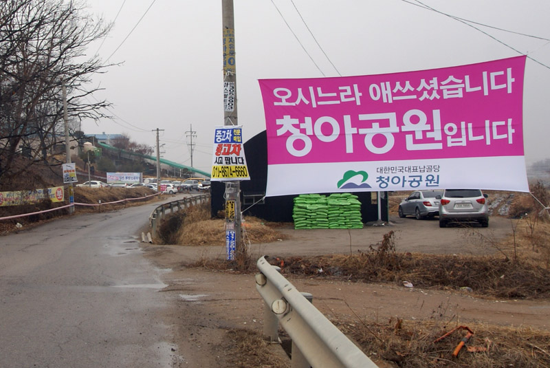 설 연휴 기간동안 청아공원 입구에서 유족들을 맞이한 환영현수막입니다.
