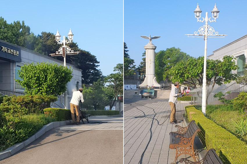 아침 일찍 광장, 진입로, 청아동산의 푸르른 나뭇잎들에 진딧물약을 쳤습니다.