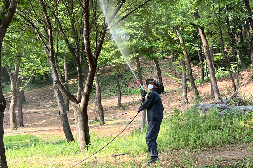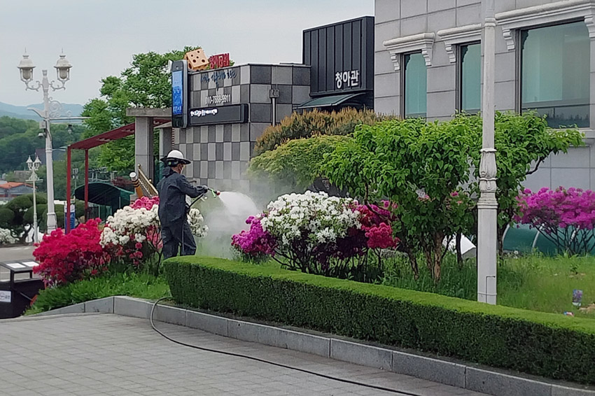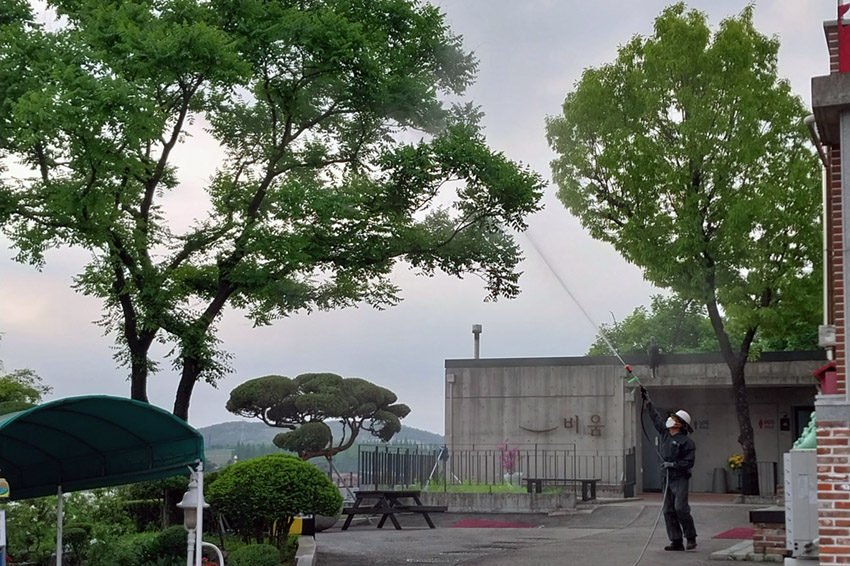 광장, 진입로, 청아동산의 푸르른 나뭇잎들에 진딧물약을 쳤습니다.