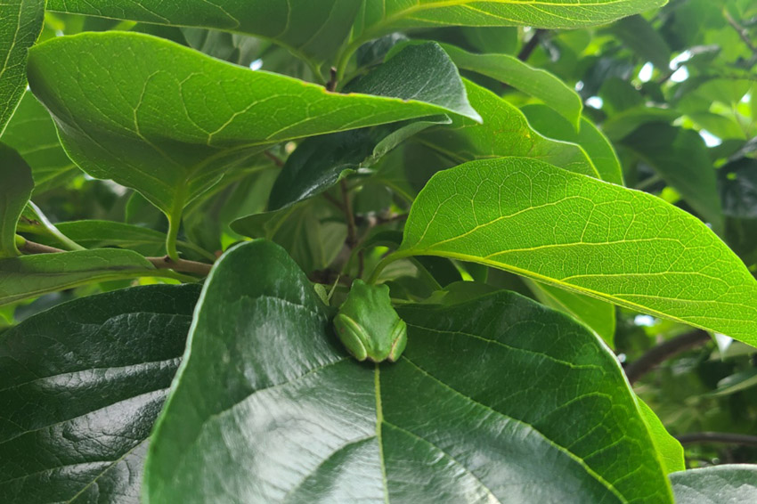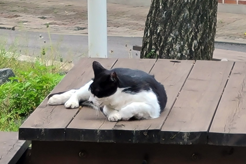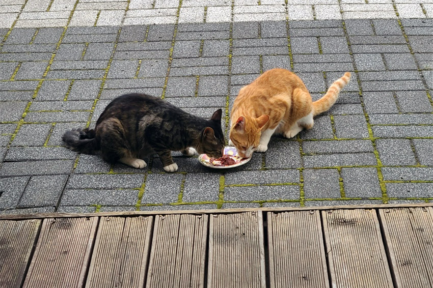 급식 먹으러 오는 고양이 손님들과 이곳저곳 보이는 청개구리와 개구리 친구들입니다.