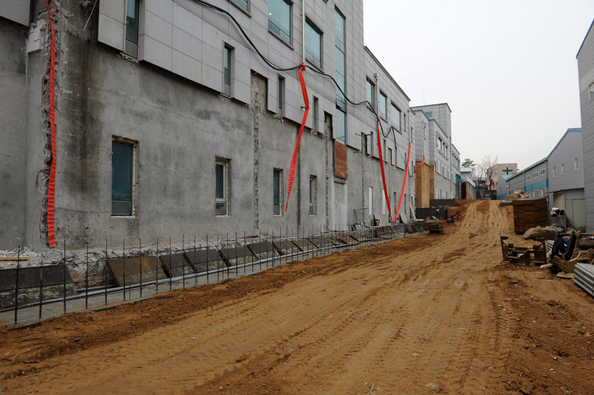 정문앞 옹벽을 해체하고 들어와서 많은 흙퍼내고 토압벽도 해체했습니다.