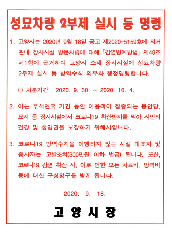 고양시가 「추석연휴 성묘차량 2부제 실시」 행정명령을 발동했습니다.