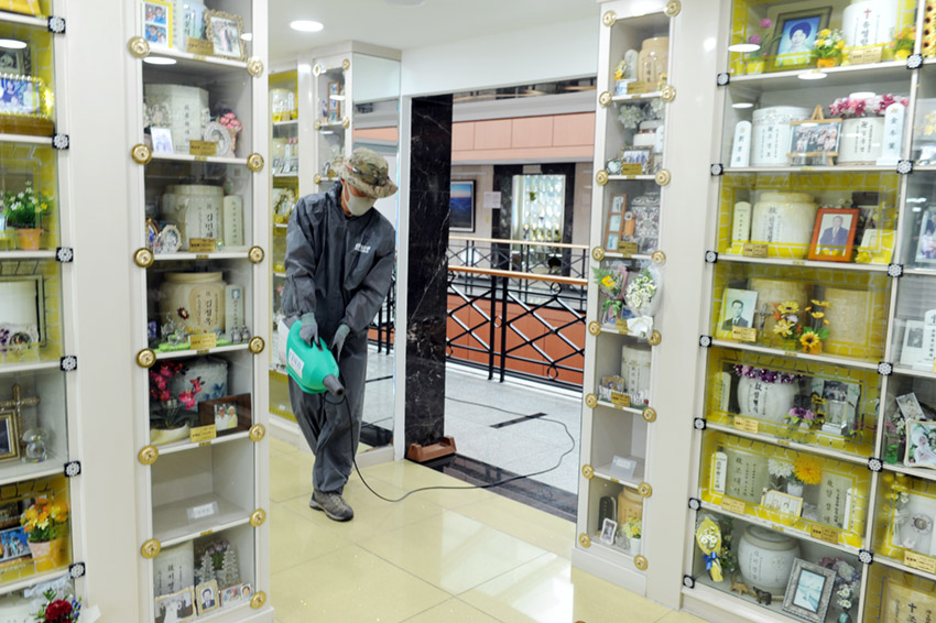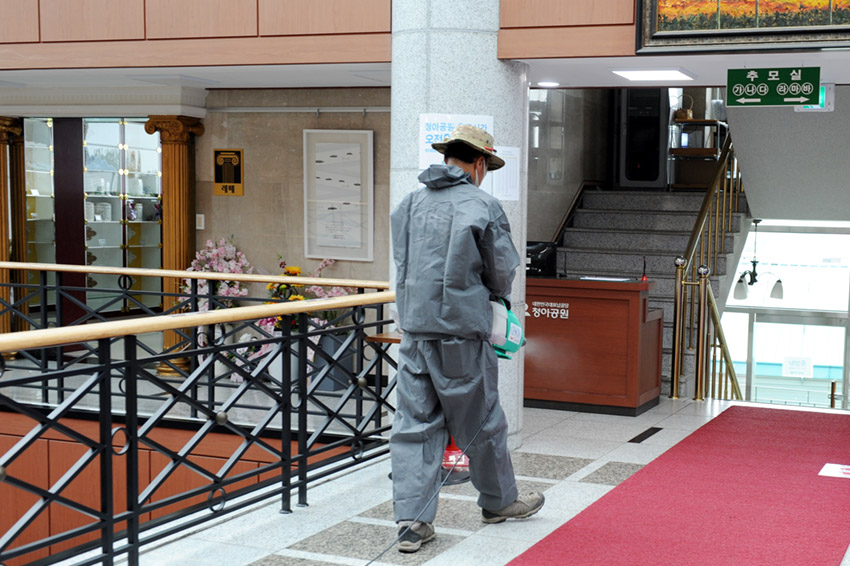 오늘 아침 추모관, 편의시설, 화장실 등 청아공원 전체 방역작업을 실시했습니다.