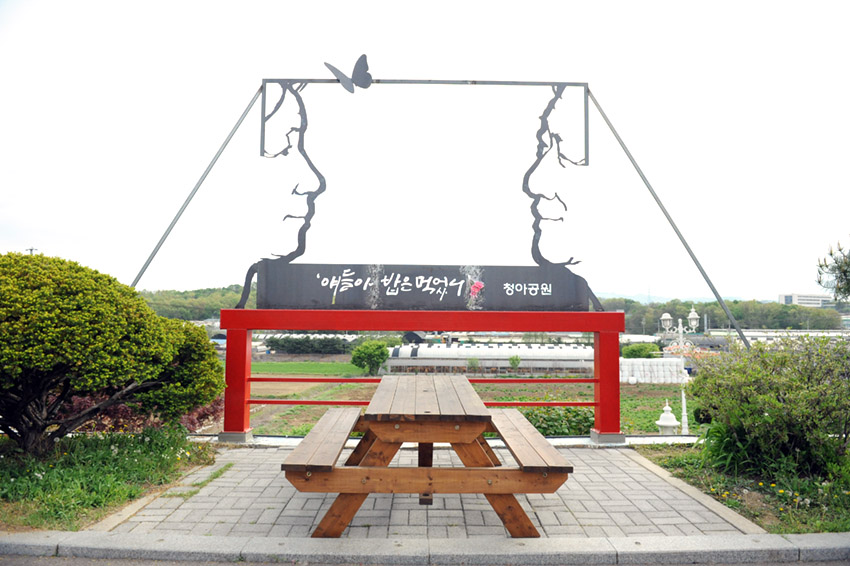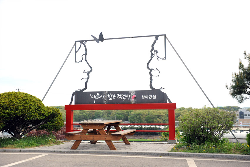 청아공원의 중심인 청아비의 맞은편, 광장 끝부분에 큼지막하게 세웠습니다.