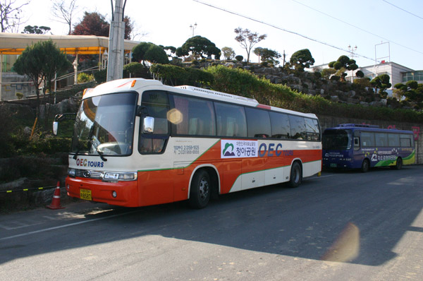 사진 뒷쪽의 작은 버스가 기존 셔틀이고, 앞에 있는 큰버스가 새로바뀐 셔틀버스입니다.