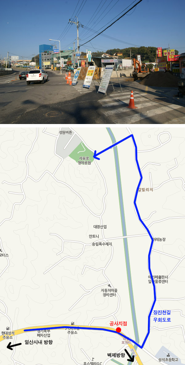 봉일천 방향 진입로(일산 시내 ↔ 봉일천)와 마골오거리 진입로(일산 시내 ↔ 벽제)입니다.