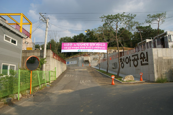 이번 청아동산 정비공사로 비주차장입구를 두배로 넓혀놓았습니다.