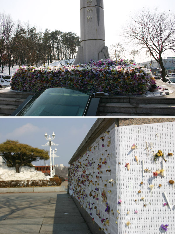 설 명절 다녀가신 10만 유족들께서 안치단에 붙여주신 추모꽃들을 모두 모아서 청아비 앞에 헌화했습니다.