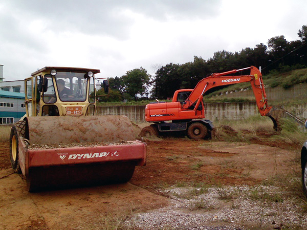 포크레인과 10톤짜리 진동로울러 대형장비 2대와