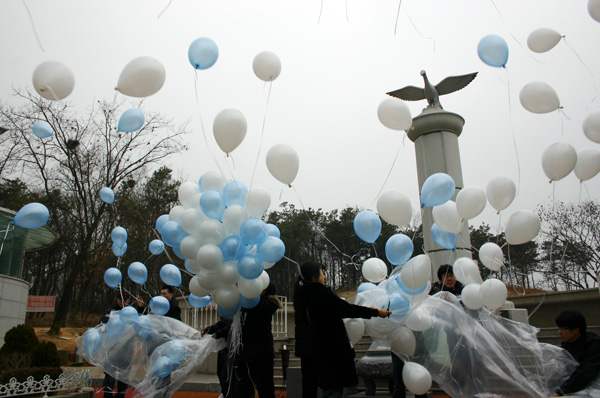 추모식 후 청아비앞에서 풍선 365개를 하늘로 날려보내며 고인의 3주기를 기렸습니다.