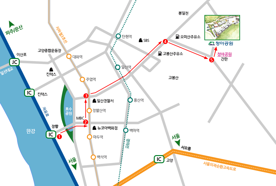 - 청아공원 ↔ 정발산역(지하철 3호선) 4번 출구 전방 일산동구청앞