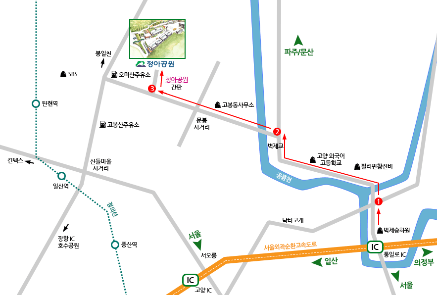 - ▶ SK주유소 지나자마자 청아공원 간판이 보이는 신호에서 좌회전 > 약 1km > 청아공원 도착
